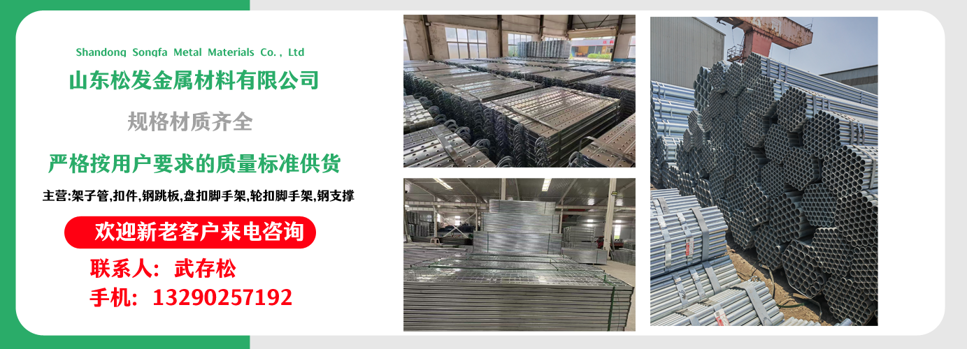 山東松發(fā)金屬材料有限公司主營架子管,扣件,鋼跳板,盤扣腳手架,輪扣腳手架,鋼支撐生產(chǎn)廠家。本廠專業(yè)生產(chǎn)銷售。  建筑用架子管、 主要用于房建,橋梁,鐵路,公路,地鐵,水庫,隧道,支撐。  架子管,扣件,鋼跳板,盤扣腳手架,輪扣腳手架,鋼支撐的優(yōu)越性及應(yīng)用“ ”產(chǎn)品因具有結(jié)構(gòu)簡單合理、設(shè)計巧妙、使用方便、安全、快捷、易于運輸、儲存、維護(hù)簡單等特點。  公司一貫堅持“質(zhì)量,用戶至上,優(yōu)質(zhì)服務(wù),信守合同”的宗旨,憑借著高質(zhì)量的產(chǎn)品,良好的信譽,優(yōu)質(zhì)的服務(wù),產(chǎn)品暢銷全球。歡迎廣大客戶來電洽談,共同發(fā)展,共創(chuàng)輝煌!  山東松發(fā)金屬材料有限公司秉承誠信服務(wù)、恪守信譽的宗旨,在同等的質(zhì)量下,保證以最低的價格,最完善的服務(wù),最高的信譽來答謝各界朋友的支持和厚愛,歡迎您的來電、咨詢,我們將竭誠為您服務(wù)!...